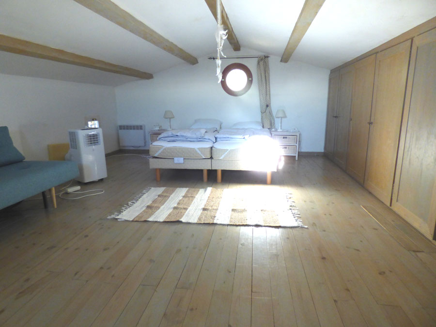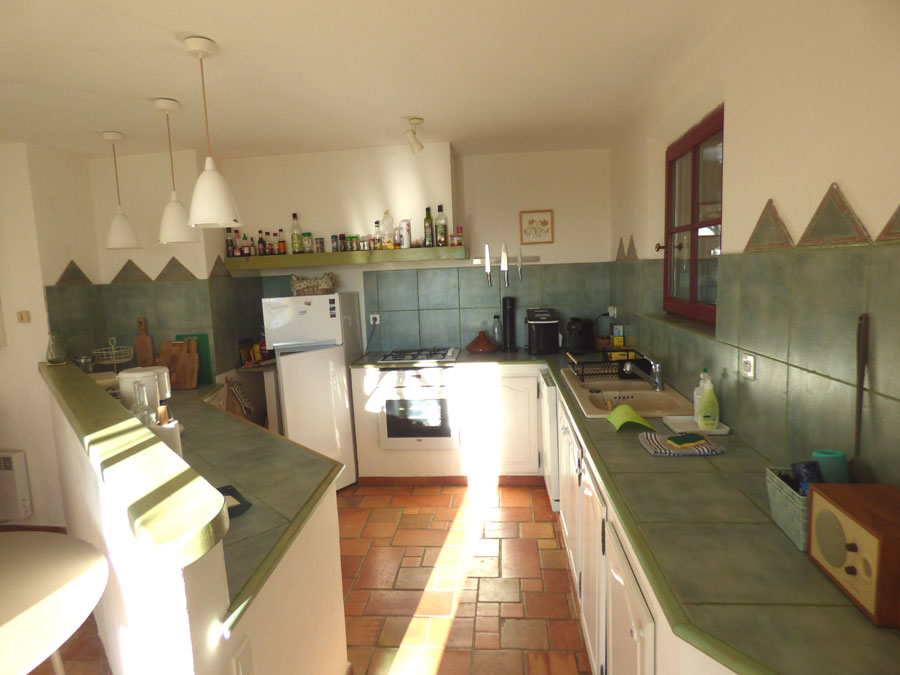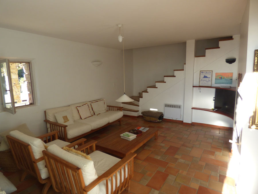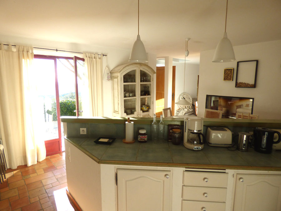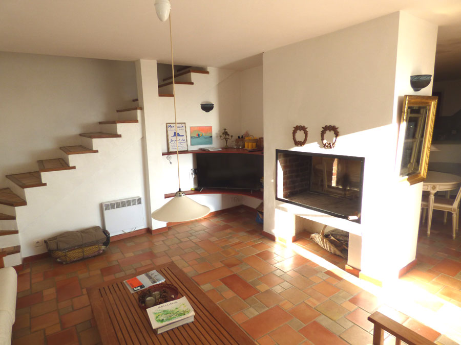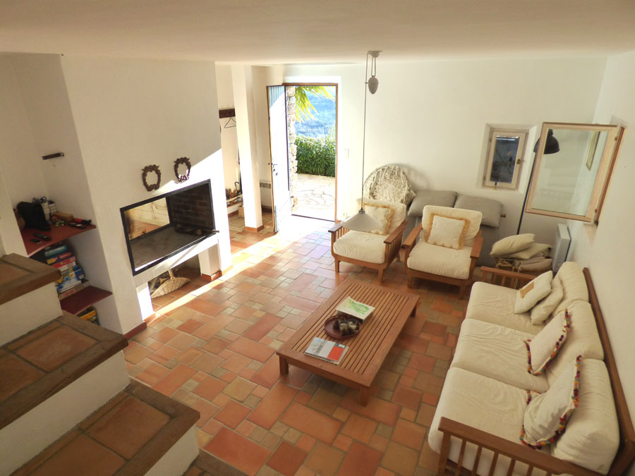 Covered terrace, living room with fireplace, fitted kitchen opening onto the dining room, separate toilet, access to the cellar, to a laundry room and a sauna.