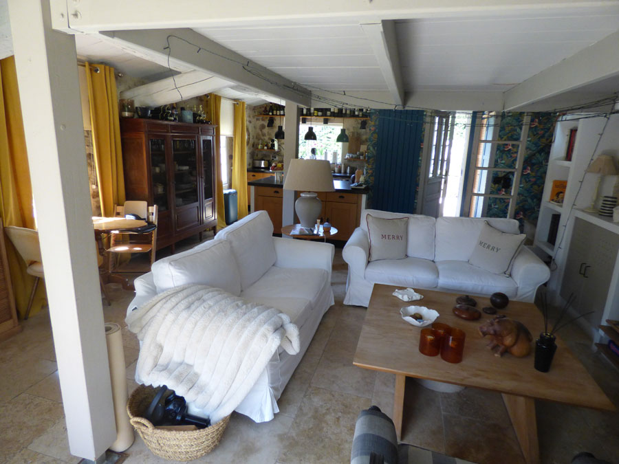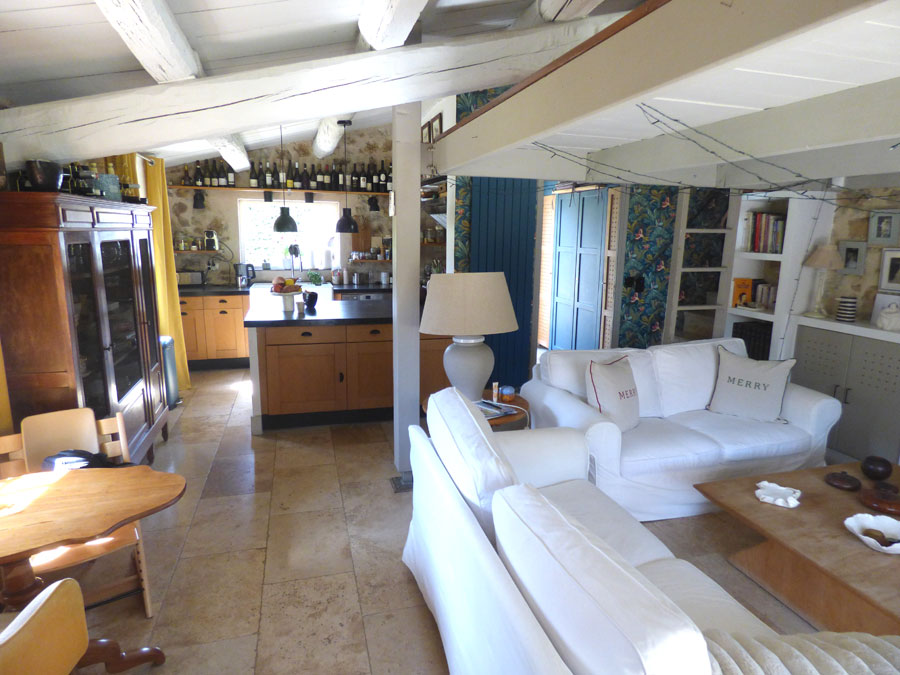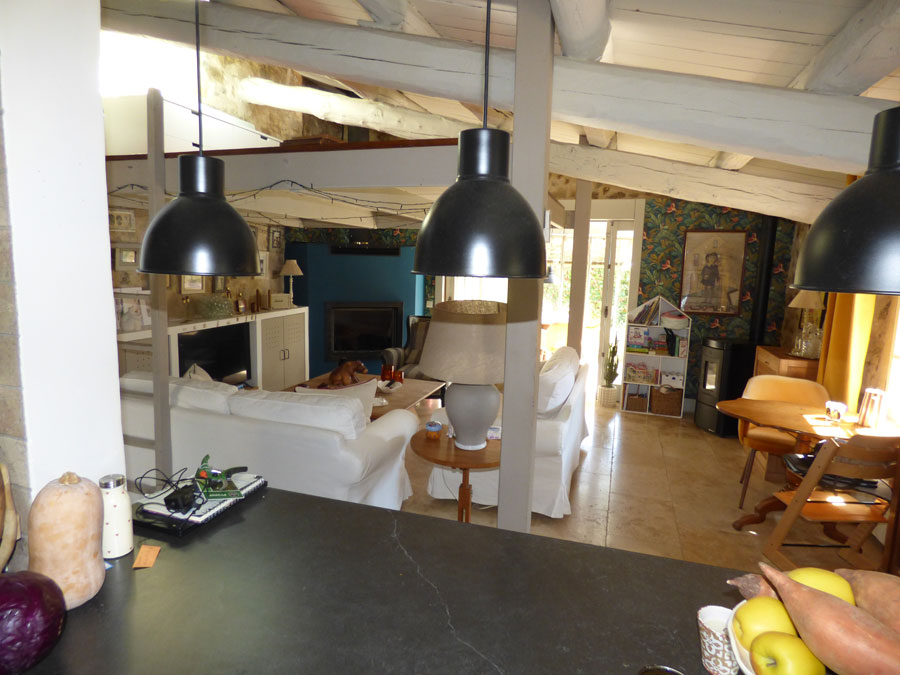 Entrée, cuisine Américaine équipée ouvrant  sur le salon avec cheminée (insert) + poêle à granulés, mezzanine, salle à manger vitrée.