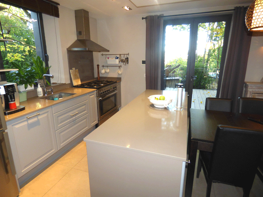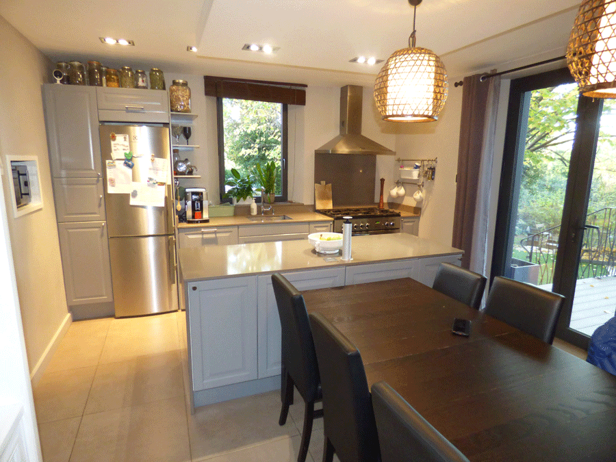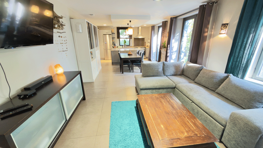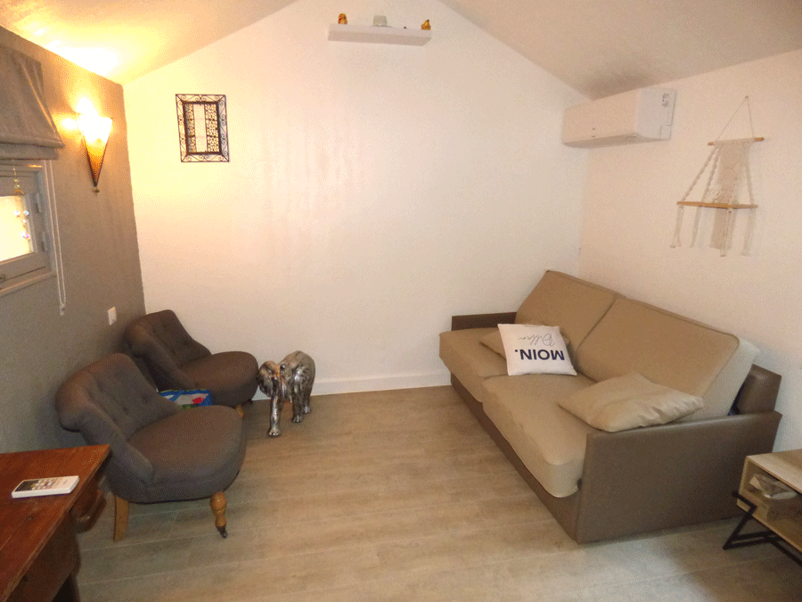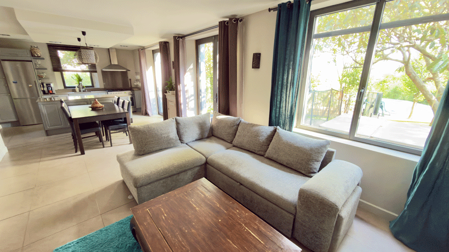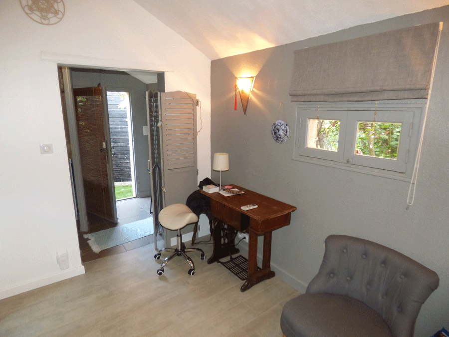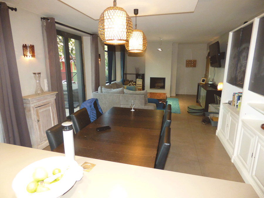 Porche, entrée, WC indépendant, cuisine Américaine équipée ouverte sur le séjour avec cheminée, donnant sur une terrasse, une chambre, salle de bains + douche, dressing, bureau, buanderie.